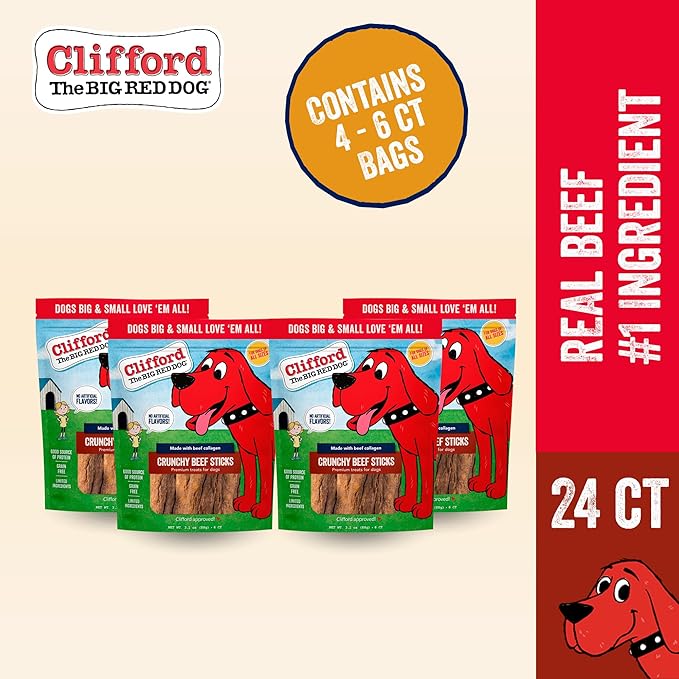 Clifford The Big Red Dog Soft Training Treats for Puppies and Dogs – Healthy, High Protein, Grain Free, Soft Puppy Treats for Small Dogs and Large – Real Crunchy Beef Sticks – 24ct