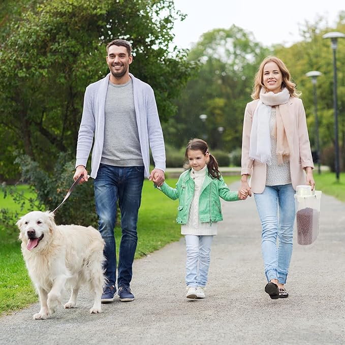 - Easy to Use:The travel dog food bin features a bigger spout makes it a breeze to dispense your pet food even large particles of dog treat. You don't need to shake and dispense the pet food any more. Its ergonomic frosted design provides one-handed holding for easy pouring and on-the-go carrying
