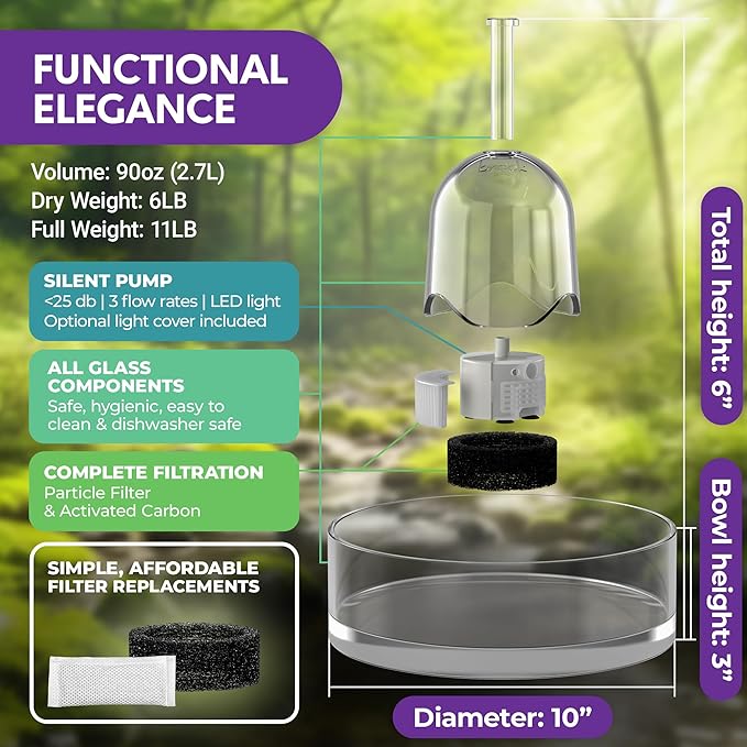 Brook Glass Pet Fountain (90oz/2.7L) β Cat Water Fountain & Small Dog Drinking Fountain β Automatic Water Dispenser Cat Fountain