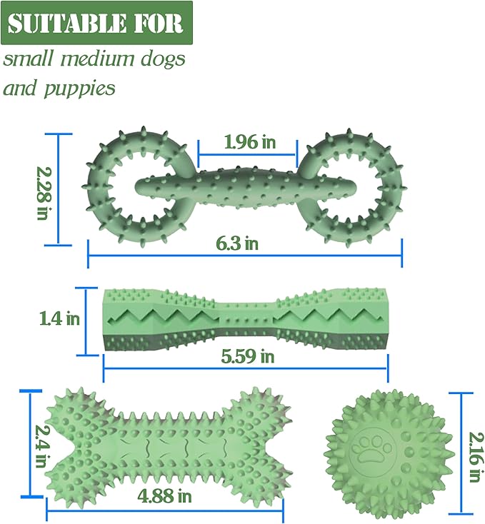 4 Pack Puppy Toys for 2-8 Months Pets Dog Chew Toy for Small Puppies Teething Toys for Cleaning Teeth Food Dispensing Soft Durable Rubber Bone Funny Ball Interactive Donut Treat Dumbbell (Green)