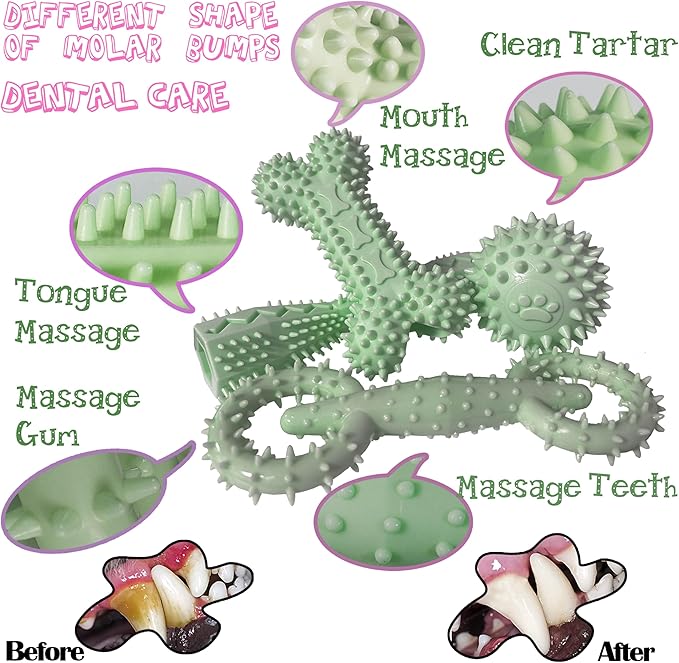 - Safe and Effective Puppy Teeth Cleaning:Made from 100% non-toxic natural rubber, these puppy chew toys are safe for your pet to chew on. Molar bulges around the toy , which can effectively clean the dog’s teeth and relieve discomfort during teething for puppie.The different unique designs feature molar bumps to clean various teeth, massage gums, and control tartar and plaque.