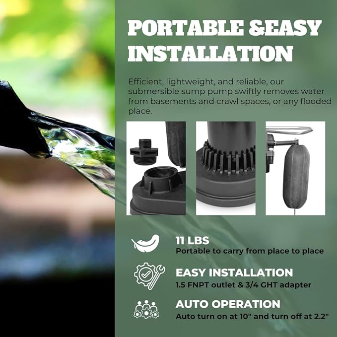 - WIDELY APPLICABLE: The powerful drainage pump tailored for tackling flooded basements, hot tubs, cellars, water tanks, confined crawl spaces, window wells, swimming pools, garden ponds, sump pits, rain barrels, and a wide array of water transfer tasks, ensuring efficient and reliable water removal.