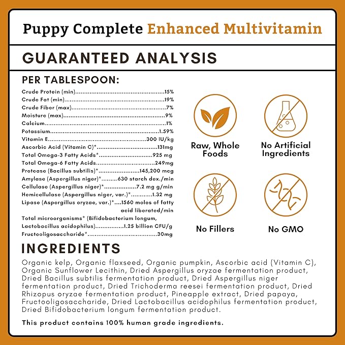 - Advanced Dog Multivitamin with Pumpkin: Your puppies health is our top priority, Canine Complete features a unique blend of organic vitamins for dogs, including probiotics and pumpkin for digestive health. Our easy to use additive fills the nutrition voids in modern pet foods.