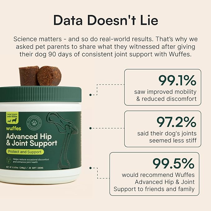 - Scientifically-Backed Ingredients: Expertly formulated by our in-house pet scientists, Wuffes Hip & Joint Support is made with ingredients known to help maintain healthy cartilage, promote joint integrity, and support long-term joint health.