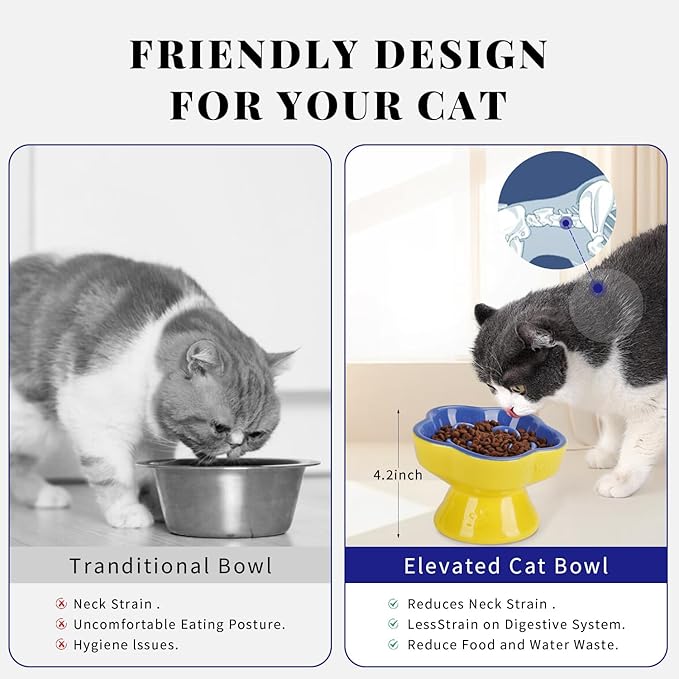 - Elevated Design: Standing 4.2 inches tall with a 15% tilt, it reduces strain on your cat's neck, helps prevent gulping and encourages slower eating. Moreover, it reduces the risk of gastrointestinal issues such as indigestion, bloating, and acid reflux, ensuring a more comfortable eating experience even during extended meals.