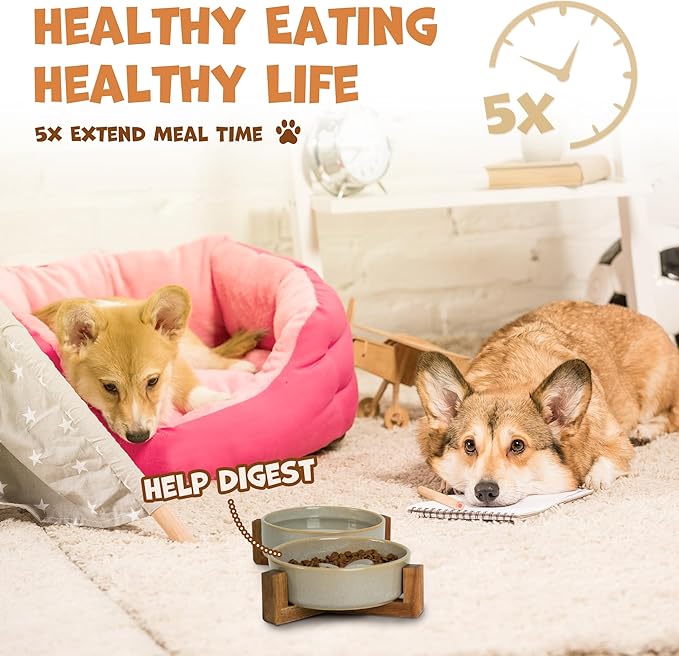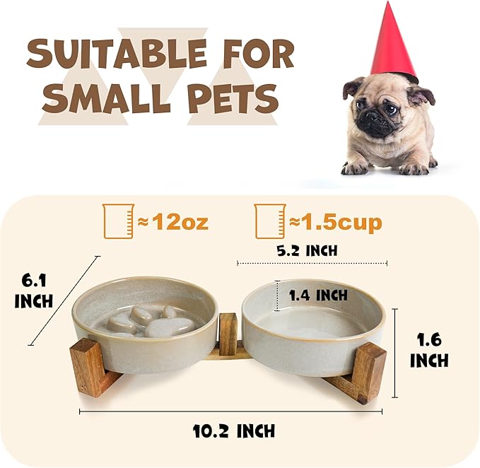 Ceramic Slow Feeder Dog Bowl Set with Stand, Cute Paw Slow Feeding Food Bowl and Water Bowl for Small Breed, 5.2" Ceramic Non Slip Dog Dishes, Grey