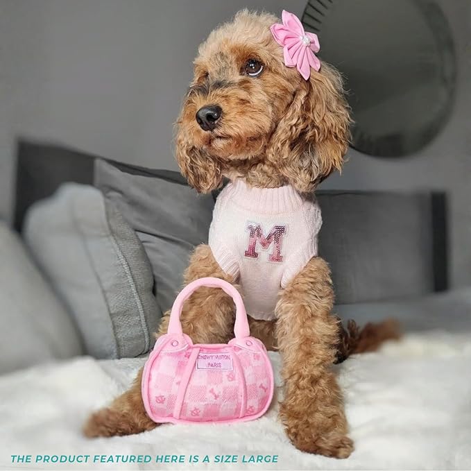 - Funny Parody Plush Dog Toy: Let your furry fashionista fetch or strut some fashion-forward fun with this Pink Checker Chewy Vuiton Handbag in a stylish pink and white checkered pattern on the plush exterior and a built-in squeaker hidden inside. It’s a playful, cute interactive dog toy that combines style & fun. Size Large 6"x4”2”.