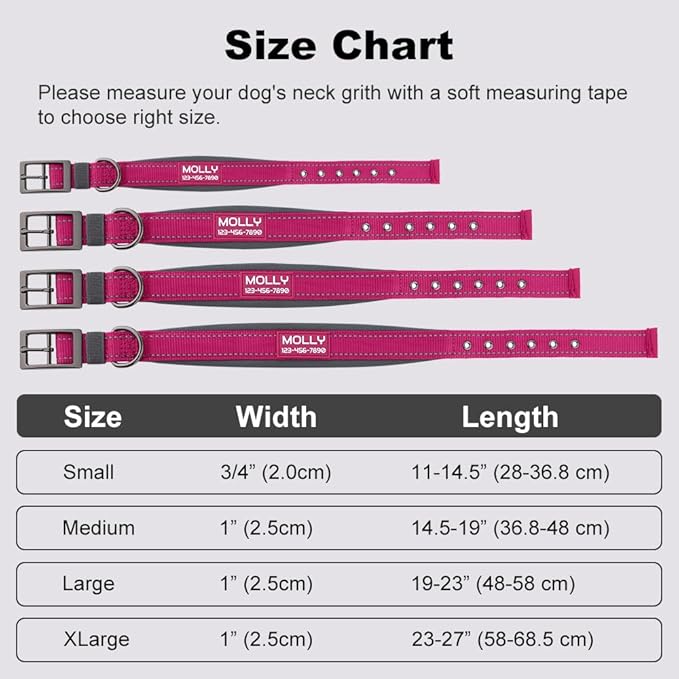 - CUSTOMIZED DOG COLLAR: Our personalized comfort neoprene padded dog collar features your pup’s name and phone number, ensuring both safety and style. Say goodbye to jangling tags and worries about them getting lost.