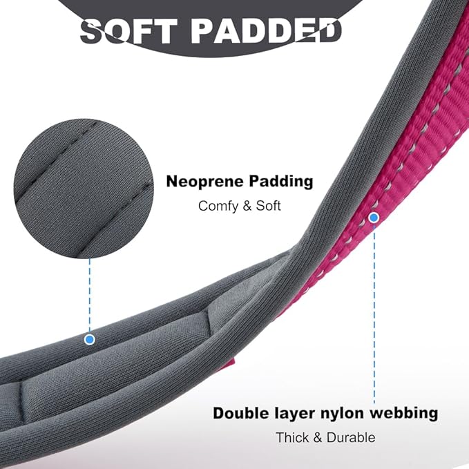 - CUSHIONED NEOPRENE: Crafted with your dog’s comfort in mind, our padded dog collar features cushioned neoprene lining that’s thick, wide, and gentle on your dog’s neck. This material protects their skin from irritation, especially during active moments or when pulling on a leash.