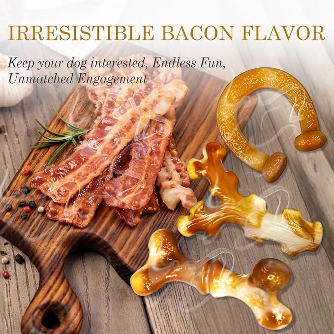 - BACON FLAVOR: 3 pack dog toys for large dogs are infused with the real bacon flavor, making them irresistible to dogs. Your furry friend won't be able to resist sinking their teeth into these toys, providing endless entertainment and peace of mind even when you're on the go.