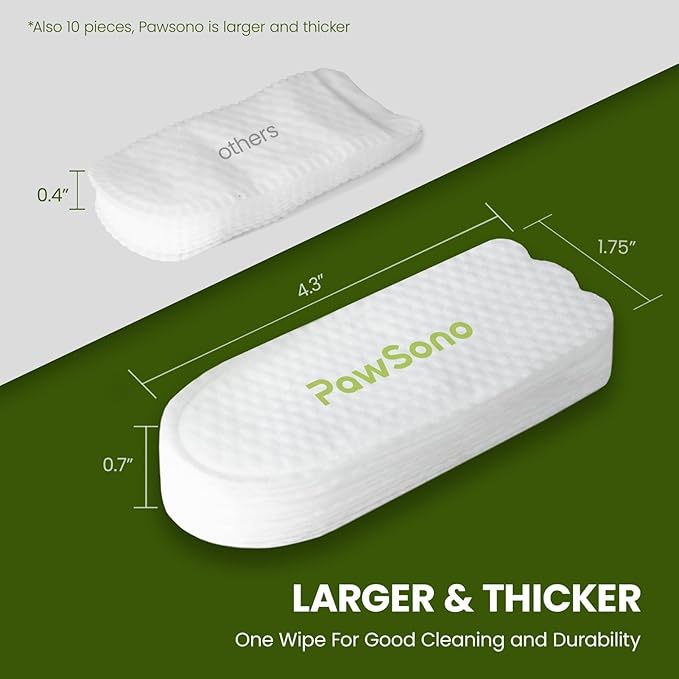 - 【Extra Larger & Thicker】PawSono cat ear wipes custom-sized for the US market. Our pet ear wipes new size eliminates the need to worry about fingers being too thick to wear them, and eliminates the concern about dog ear wipes finger slipping off.
