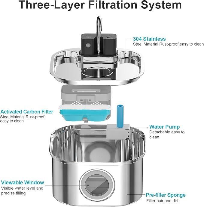 - Transparent Water Level Window- The automatic cat water fountain has a capacity of 3.2L, with high and low water level lines marked in the container, which is enough for multiple cats and dogs to drink at the same time. The f is equipped with a Transparent water level window, and the remaining water volume can be easily seen through the window, which helps to add water in time, so you don’t have to worry about forgetting to add water anymore!