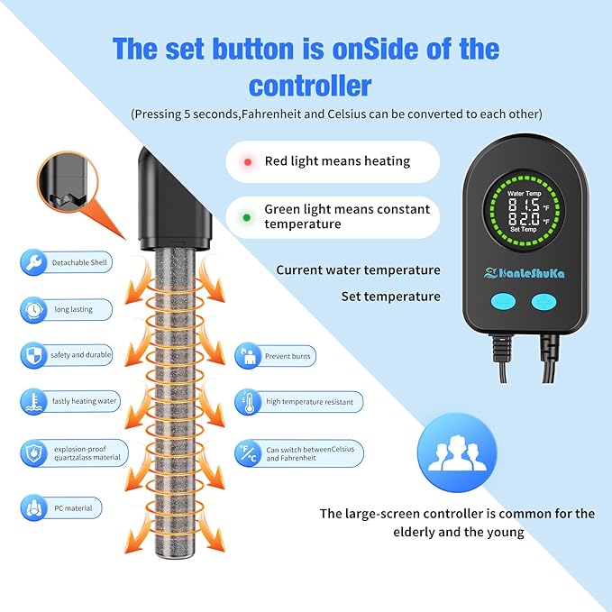 - 🍀【Smart Dual Temperature System】: Featuring a dual temperature system, this heater allows you to freely switch between Fahrenheit and Celsius by holding both buttons on the temperature controller for 2-3 seconds. The intuitive design makes it easy to monitor and adjust the temperature, catering to both beginners and experienced aquarists.