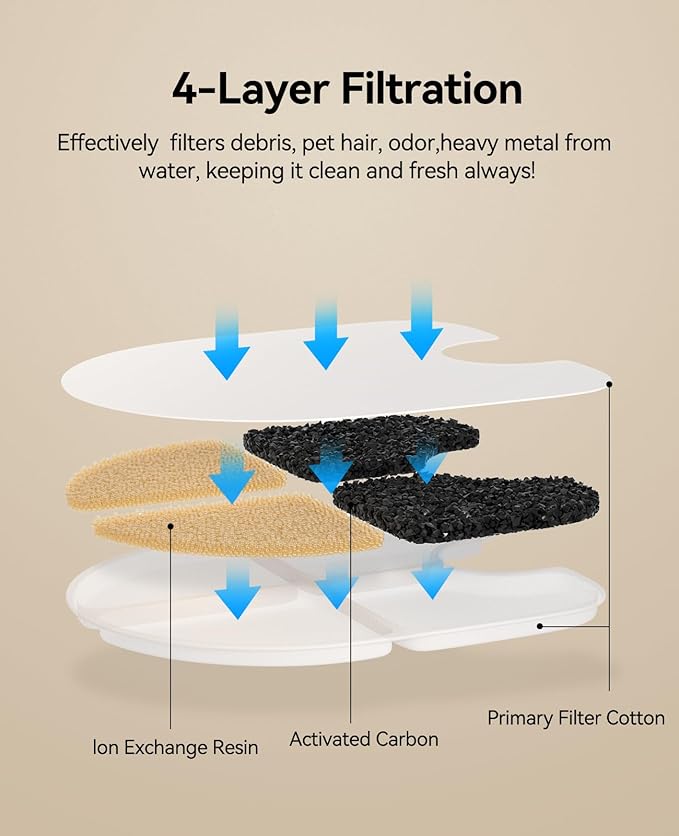 - Every Sip is Clean and Fresh: 4-layers of filter system ( high-density cotton, Ion exchange resin, coconut shell activated carbon, non-woven fabric ), keeping water cycling and being filtered