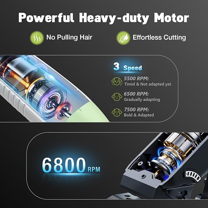 - 【Efficient, Low-Noise Design – Stress-Free Grooming】Equipped with a low-noise motor operating at just 55dB, keeping pets calm and relaxed. The 6800 RPM motor is optimized for thick coats, minimizing hair-pulling and reducing grooming time by 45%.