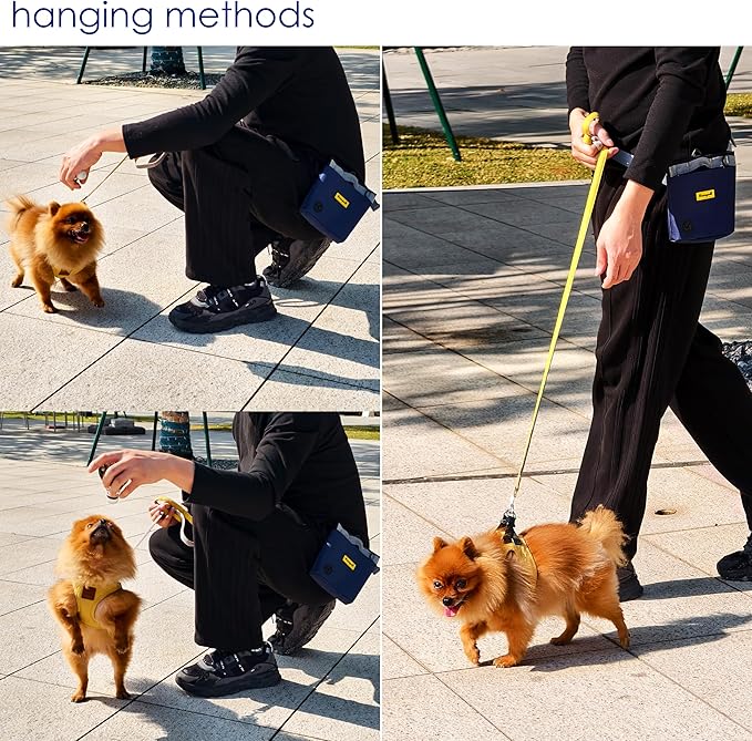 - 2.Ample Space for Accessories: The silicone bag can hold up to 2 cups of dog treats, serving as an ideal dog treat bag. The front of the pocket treat pouch features a large pocket for your phone, and an additional opening has been added for easy access to poop bags. On the side of the dog training treat pouch, there's a ring to hang the included dog training clicker, keeping it within easy reach at all times. This bag is perfectly suited for your outings and is an essential dog bag for treats, whether you're training or walking your pet.