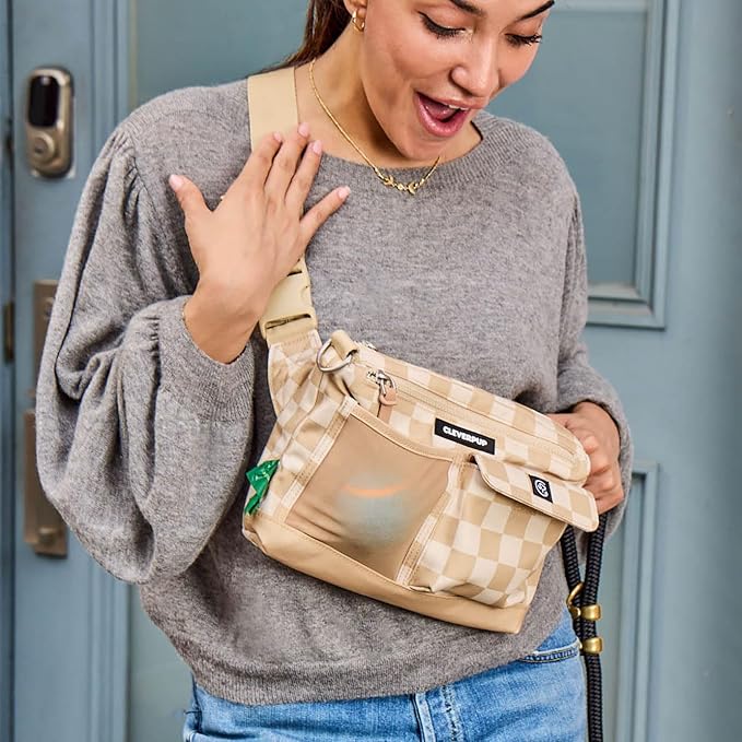 Dog Walk & Train Sling Bag - Hands-Free 2-In-1 Treat Pouch, Poop Bag Holder, Clicker, Phone Pocket - Crossbody/Fanny Pack, Adjustable Strap - Checkerboard