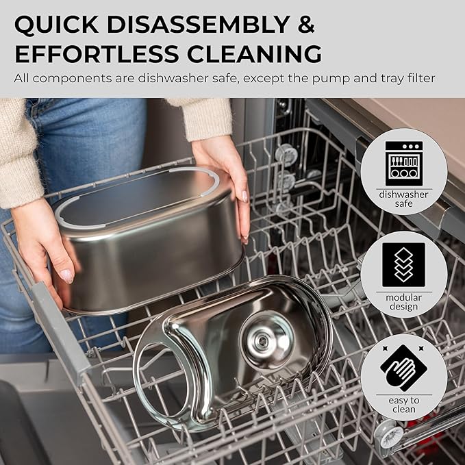 - [EASY MAINTENANCE & DISHWASHER SAFE]: The LIPPUP automatic cat water dispenser features stainless steel parts that are top-rack dishwasher safe and is easy to disassemble, clean, and reassemble, saving you time and effort.