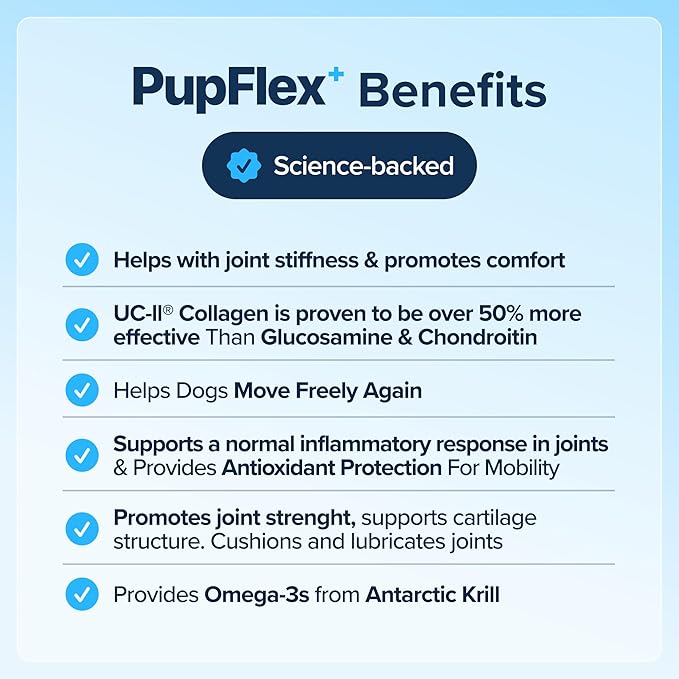 - VET-FORMULATED HIP & JOINT CHEWS FOR DOGS – Powered by UC-II dog collagen, PupFlex+ is a premium dog joint supplement for large breed, medium and small active pups. It supports flexibility and helps restore mobility in just 30 days.