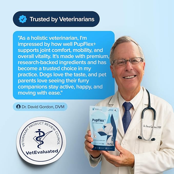 - TASTY, ALL-NATURAL SUPPORT DOGS LOVE – Made with Antarctic QRILL for Omega-3s and antioxidants, PupFlex+ promotes joint health and vitality. Non-GMO, veterinarian-formulated, certified by VetEvaluated, a premium choice in dog health supplements.