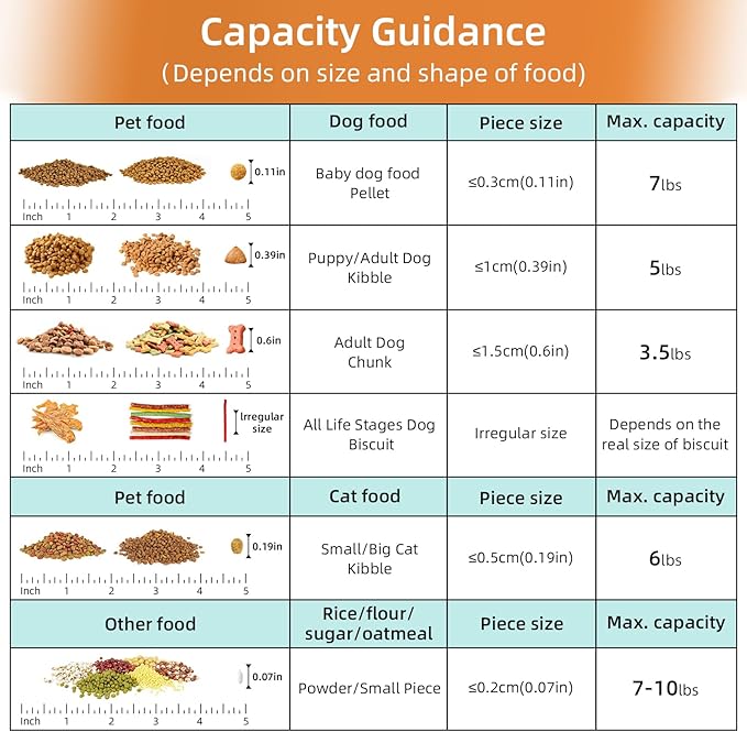 - CAPACITY : Our Pet dry food storage containers , cat food storage container combination capacity is 11 LBS, and can hold approximately 5 -11 pounds of pet food and rice,Depends on the size of the food。It also works well with regular kitchen food,Such as rice,flour,cereal,beans,nuts,snacks or whatever you like。