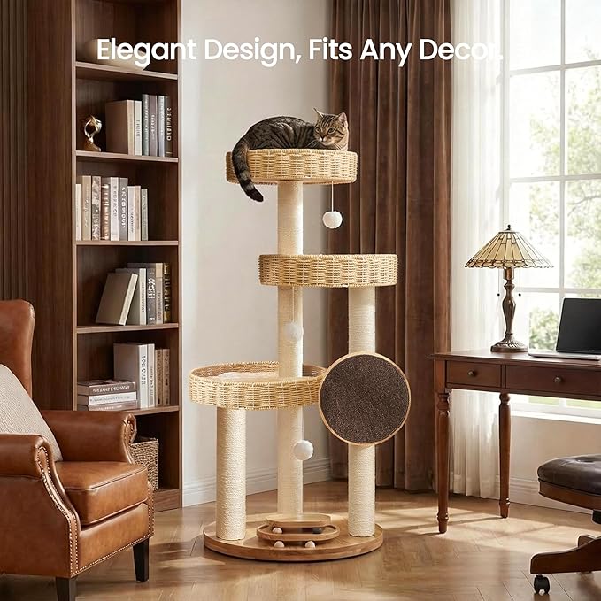 - 【All-in-One Activity & Relaxation Center】 This multi-level cat condo is a complete playground. It integrates climbing platforms, multiple scratching surfaces, a spacious cat house for privacy, cozy hand-woven beds for lounging, and interactive hanging toys. It fulfills all your cat's instincts for climbing, scratching, playing, and observing from a high perch.
