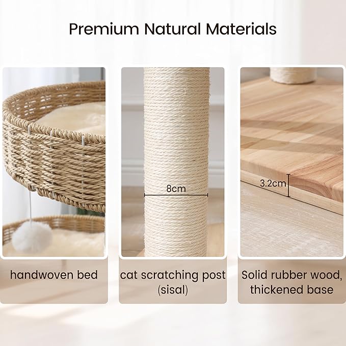 - 【Natural & Premium Materials】 Crafted from high-quality, eco-friendly solid rubberwood, this cat tree ensures a safe, odor-free environment for your pets. It features durable 8-cm thick sisal-wrapped scratching posts to satisfy natural scratching instincts and protect your furniture, complemented by luxuriously soft, hand-woven cat beds for ultimate comfort
