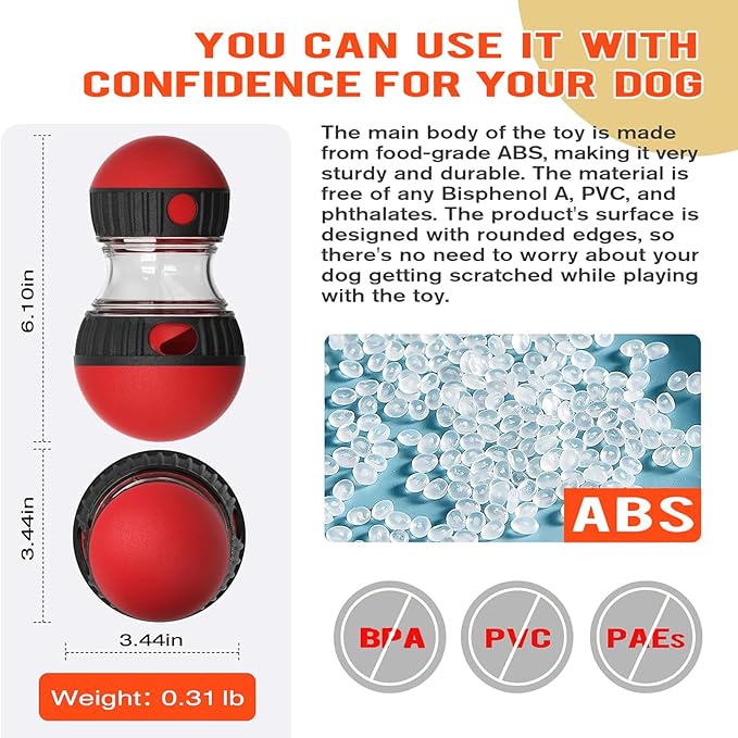 - Made of food-grade ABS materials that is free from harmful substances such as bisphenol A, PVC, and phthalates, this toy ensures the safety and well-being of your dog. It gives you peace of mind while your furry friend enjoys hours of entertainment.(Note:This is not a chew toy , not suitable for aggressive dogs.)