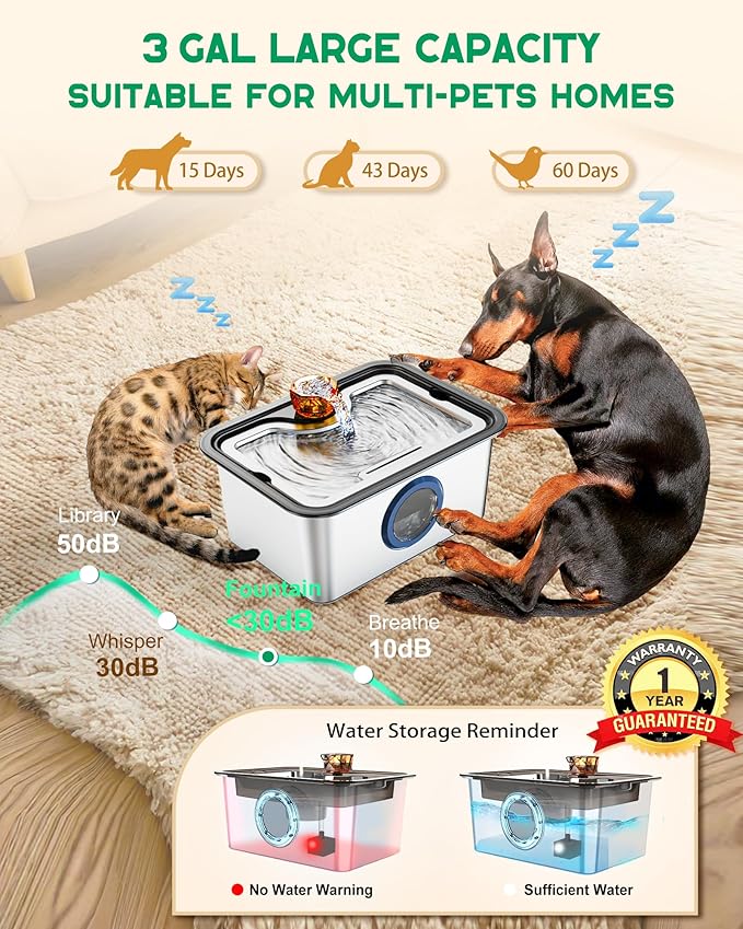 - Keep your pets hydrated with the 3 gallon water dispenser for dogs with no spill dog bowl—designed for cats and dogs who prefer fresh, flowing water. while the ultra-quiet pump ensures a peaceful environment. And enjoy the convenience of a large 3-gallon tank that reduces refills. Easy to clean and BPA-free!