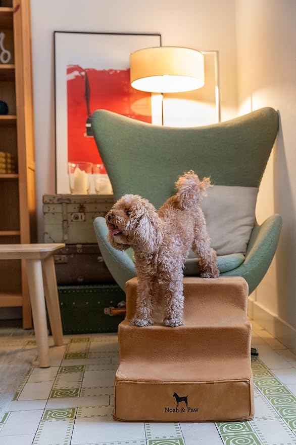 - The Noah & Paw dog stairs leather collection offers a unique and luxurious solution to assist puppies, senior cats, and small dogs with climbing. The pet stairs are crafted with vegan leather to blend in with any home decor. The steps are adorned with a plush fabric.