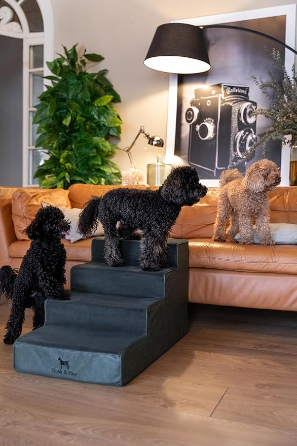 - The Noah & Paw dog stairs leather collection offers a unique and luxurious solution to assist puppies, senior cats, and small dogs with climbing. The pet stairs are crafted with vegan leather to blend in with any home decor. The steps are adorned with a plush fabric.