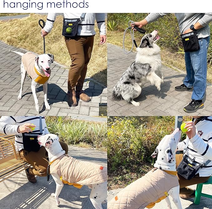 - 3.Enhanced Magnetic Closure: The bag features two sets of powerful magnets at the opening, ensuring automatic closure and preventing food from spilling, even when bending over. A convenient pull tab allows for one-handed opening when you need access to the contents of your dog treat pouch. The strong magnets make it a perfect solution for training and walking, ensuring your treats stay secure in the dog treats holder for training.