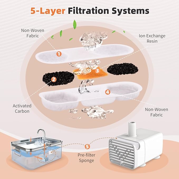 - 5-Stage Filtration Filtration System - The filtration system of pet water fountain includes 4 filter layers (non-woven fabric, ion-exchange resins, activated carbon and sponge) , which can filter dropping dirt debris and shedding fur effectively, so as to keep the water source clean and the healthy growth of pet.