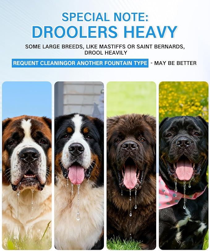 - NOT FOR HEAVY DROOLERS: For large dog breeds or dogs known for prolific drooling (like Mastiffs, Saint Bernards, etc.), a traditional water bowl is a more practical and hygienic option to maintain water cleanliness
