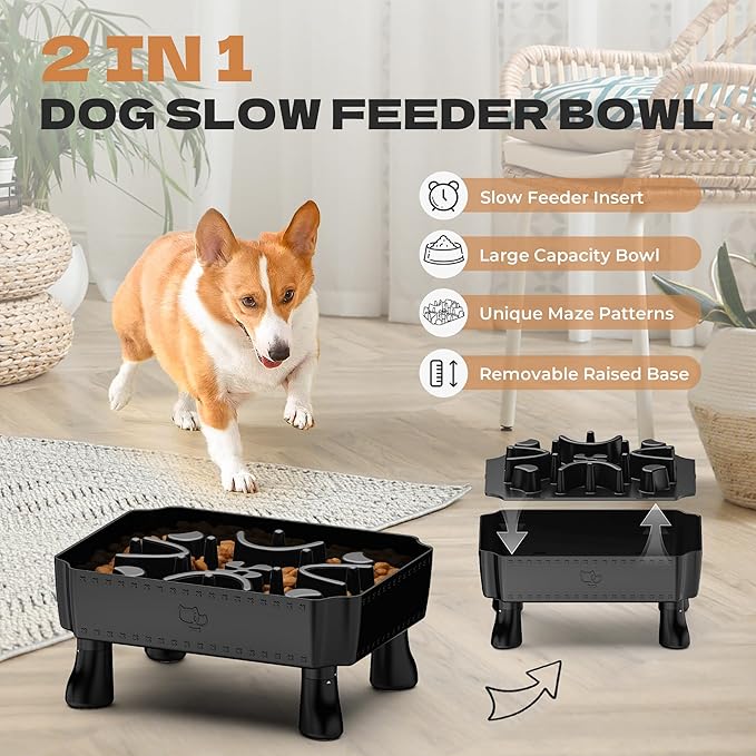 - 2-in-1 Removable Bowl: This 2-in-1 dog bowl becomes a slow feeder with the puzzle insert tray or a standard single bowl without it with wet and dry foods. The bowl is detachable, allowing for easy hand washing or cleaning in the dishwasher