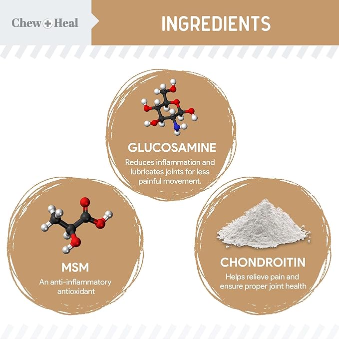 - Chew + Heal's hip and joint chews for dogs strengthen muscle, cartilage, and joint health, as well as relieve pain and discomfort, and reduce inflammation