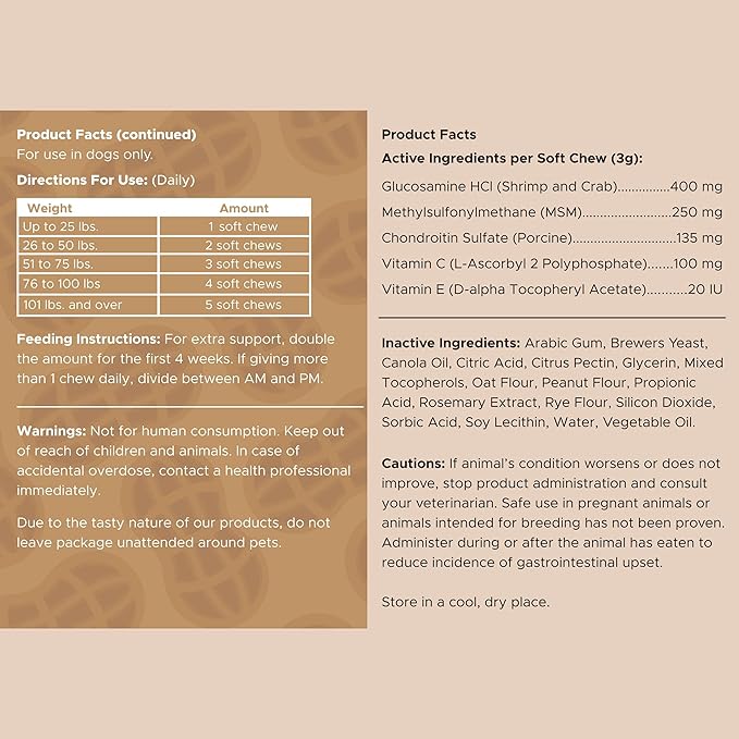 - Made with an extra strength formula with 400 mg of glucosamine per chew, plus MSM, chondroitin, vitamin C, and vitamin E