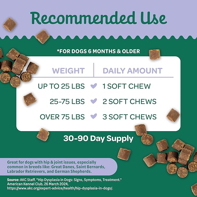 - TASTY & EASY TO ADMINISTER – Delicious soft chews with real chicken flavor your dog will love. Convenient daily chew format – no pills, powders, or messy liquids required.
