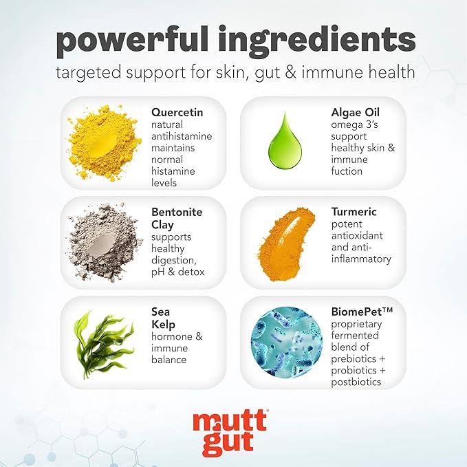 - ๐๐จ๐๐ญโ ๐๐ก๐ข๐ง๐ฒ ๐๐จ๐๐ญ & ๐๐๐๐ฅ๐ญ๐ก๐ฒ ๐๐ค๐ข๐ง: MuttGut Allergy & Immune Chews for Dogs contain omega-3s from Algae Oil to nourish your pupโs skin, reduce dryness, and keep their coat soft and shiny. Itโs like a spa day in a chewโperfect for dogs with dry, itchy skin!