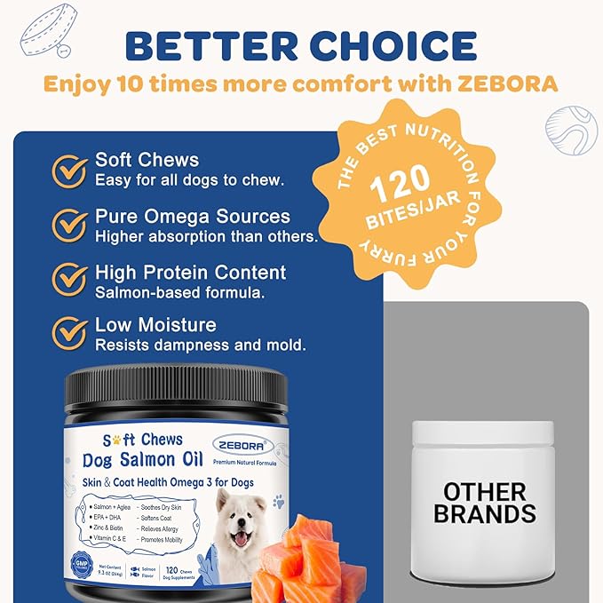 ZEBORA Salmon Oil for Dogs Skin and Coat - Omega 3 6 9 Fish Oil Soft Chews for Dogs Itchy Skin Relief - Dog Fish Oil Supplements EPA DHA Rich with Vitamins C & E - Allergy Relief & Shedding, 120 Ct