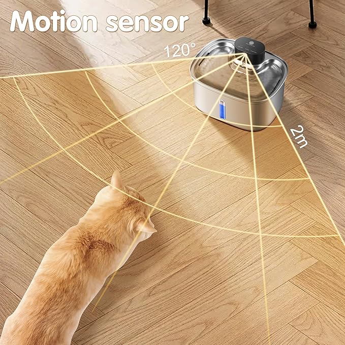 - 3 Working Modes: BOORCA automatic cat water fountain has three working modes, more choices to meet your pet's needs. ① Sensor Mode (120° x 5ft range): Water runs for 20s when cat approaches; ② Timed Mode:Water runs for 20s every 30 minutes; ③ Continuous Mode: Water flows continuously (Only available when plugged in). (Sensing mode is the most recommended). Featuring an ultra-quiet water pump (≤30dB), our pet water bowls dispenser ensures a peaceful environment for you and your pet.