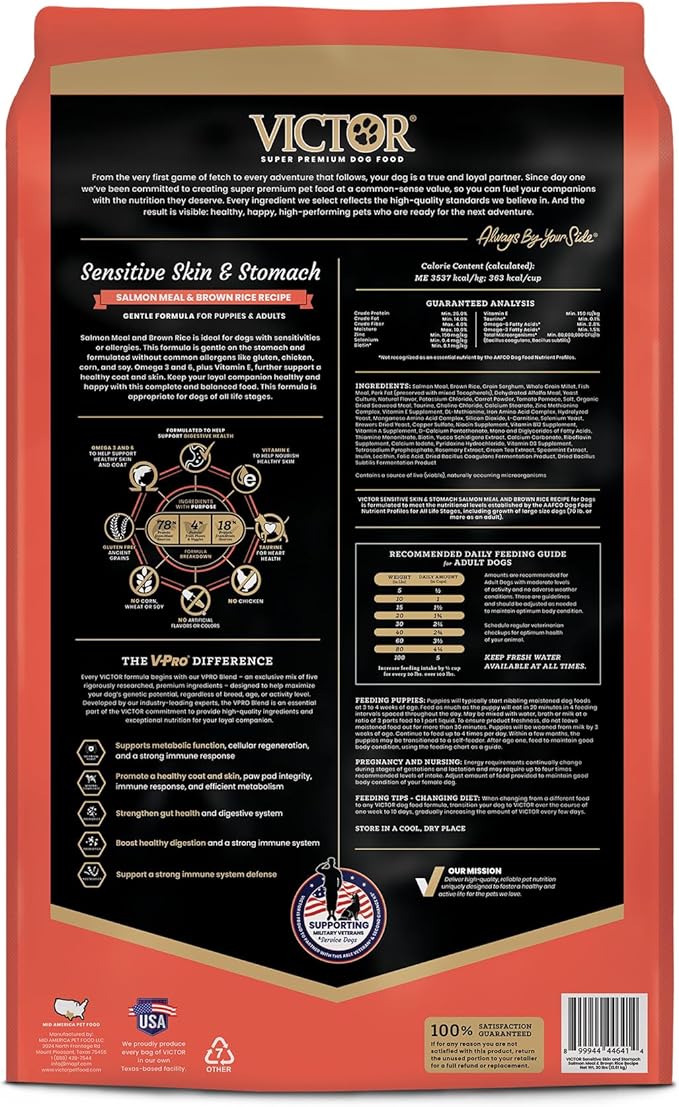 VICTOR Super Premium Dog Food — Sensitive Skin and Stomach — Salmon Meal & Brown Rice Recipe Dry Kibble — Gluten Free, No Chicken, Ideal for Dogs with Allergies — Adult and Puppy Food, 30 lb
