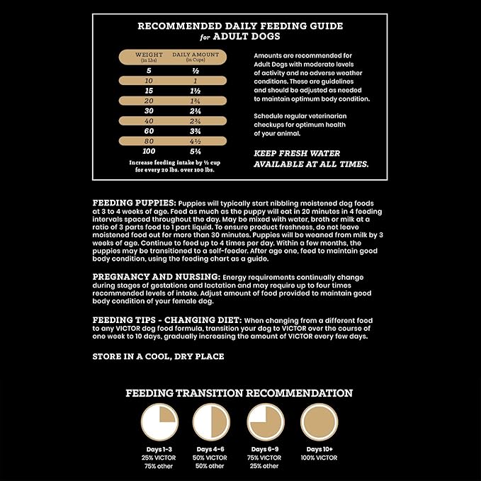 - MADE IN THE USA: We proudly produce every bag of VICTOR kibble in our own Texas-based facility and do not waver in our commitment to high-quality nutrition. A majority of ingredients of our pet food come from ranches, farms and other trusted suppliers who are within a day’s drive of our East Texas plant.