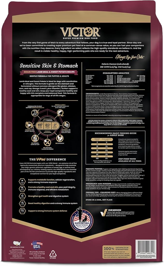 VICTOR Super Premium Dog Food— Sensitive Skin and Stomach— Grain Free Lamb Meal and Sweet Potato Recipe Dry Kibble— Gluten Free, No Chicken, Ideal for Dogs with Allergies — Adult and Puppy Food, 15 lb
