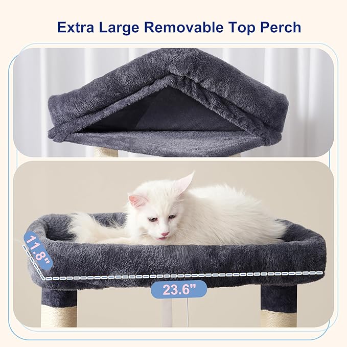 - Removable Top Perch:This big cat tree with top perch(23.6'' L*11.8''W)is specially designed for adult large cats including Maine Coon. The fully padded edges allow your pet to lie down comfortably. Meantime, the fabric cover is detachable as your need.