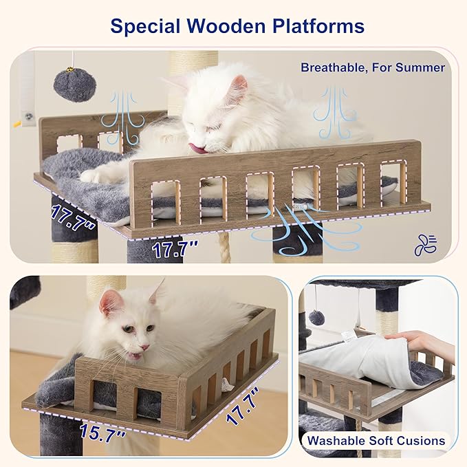 - 2 Wooden Perches: This tall cat tree is specially designed with two wooden platforms at different heights to help cats of all sizes climb freely. Additionally, the soft cushions on the platforms are not only non-slip but also make it comfortable to rest.