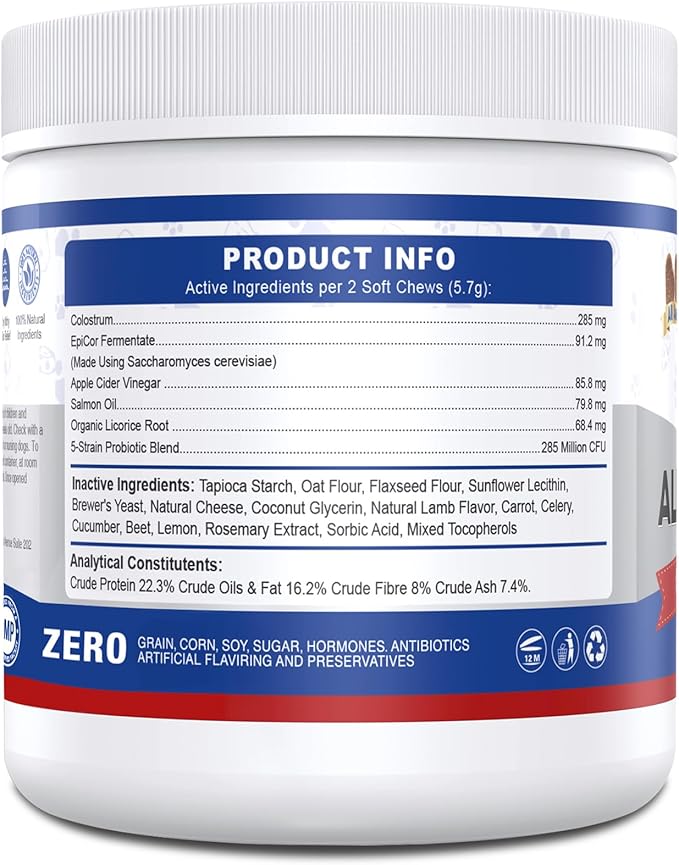 - SAFE AND NATURAL INGREDIENTS: Our dog allergy chews are made from natural high-quality ingredients, including Omega-3, colostrum and other Premium ingredients, which can help relieve your dog's skin itching. Each allergy relief for dogs itching chew is an immune booster, fortified with a special blend of nutrients and probiotics to enhance your dog's defense against allergens