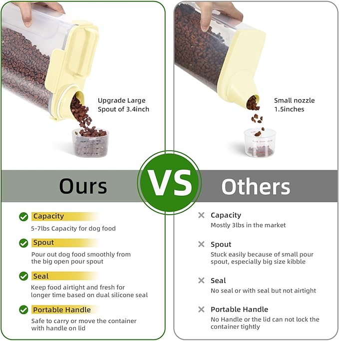 - WHAT YOU GET?:The small dog food bin comes with a 1-pack airtight pet food storage container with a clear measuring cup and an upgraded large spout for easy pouring of pet food at any time. This dog food storage containers can be a gift The perfect gift for any home.