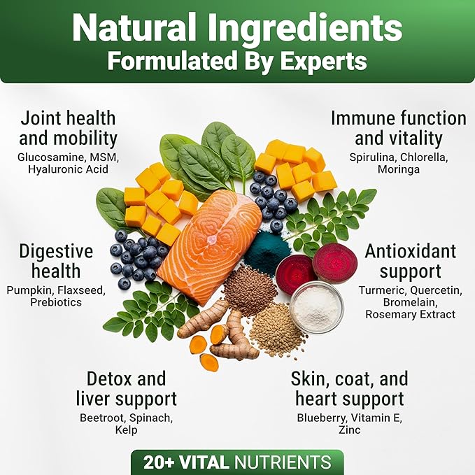 - Digestive Wellness & Immune Defense – Featuring Fructooligosaccharides (a natural prebiotic), pumpkin, beetroot, and kelp, this formula supports gut health and regular digestion. This premium green supplements for dogs with Quercetin, Turmeric, and Bromelain help promote immune balance.