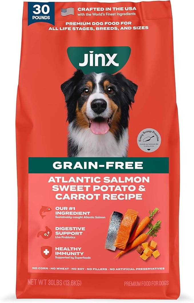 Jinx Premium Grain-Free Dry Dog Food, for All Lifestages - Real Salmon, Sweet Potato & Carrot Kibble with Superfoods for Immune Support & Probiotics for Digestive Support - No Fillers - 30lb